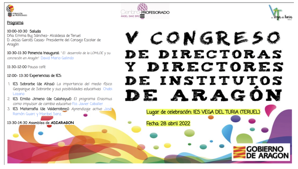 Esta semana, desde el Centro de Profesorado Ángel Sanz Briz, queremos destacar el Quinto Congreso de Directoras y Directores de Institutos de Aragón que se realizará en el IES Vega del Turia el 28 de abril.