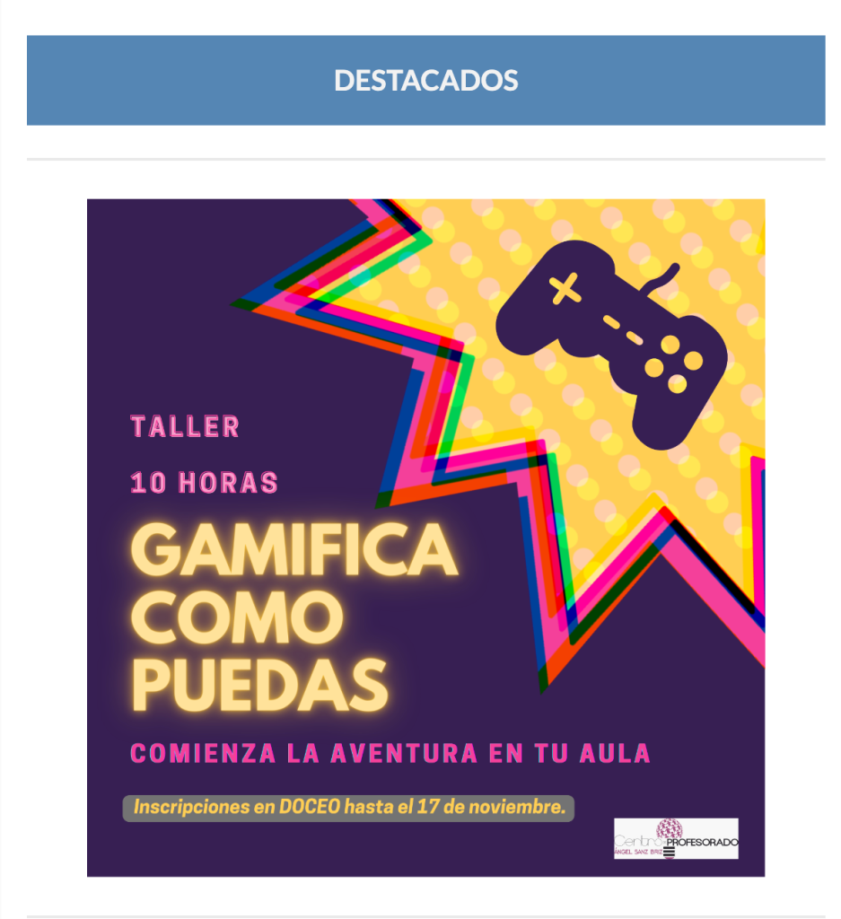 Esta semana, desde el Centro de Profesorado Ángel Sanz Briz, destacamos el taller que comienza este mismo jueves ¡Gamifica como puedas!, en el que contaremos con Norberto Cuartero, maestro experto en gamificación aplicada a la educación, uso del aprendizaje basado en el juego en el aula y creación de contenidos digitales.